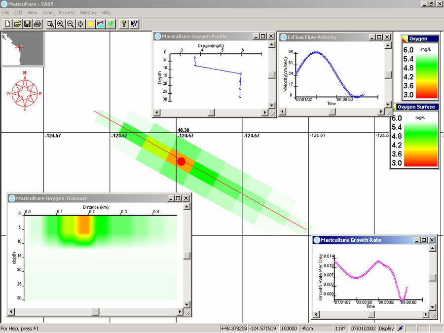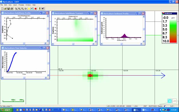 The red line is a transect that runs through the centerline of the plume; it yields a vertical contour plot of oxygen vs. depth that is shown in the lower left-hand corner of the figure. We see from this figure that the concentration of oxygen is lowest in the farm, and that the oxygen-depleted water is found within the upper 10 meters of the water column, which is the depth of the farm. These results are consistent with field measurements but are exaggerated here for the sake of demonstration by having very high density of fish in the farm. Normal oxygen deficit plumes from commercial salmon farms are no longer than about 30 m downstream, and usually much less (Rensel 1989, Heinig 2000, Rensel unpublished NPDES 1986-1995 data). Similar dynamic 3-dimensional views of the "farm's waste plume" for other variables of interest such as dissolved nitrogen and phytoplankton can also be displayed simultaneously. The plots at the top of the screen show the vertical distribution of oxygen within and below the farm (left) and the time series for current velocity (right). The plot at the bottom right corner is the time series for the growth rate of the fish. Figures B and C show model outputs with some of the available sediment plots.